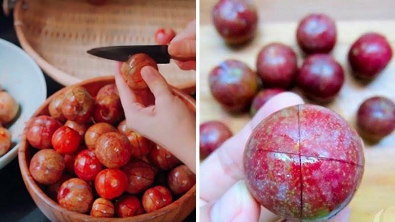 Bạn rửa mận với nước cho sạch, sau đó ngâm mận với 30g muối trong vòng 15 phút rồi rửa lại 1 lần nữa, để cho ráo. Bạn tiến hành khía mận thành 6-8 khía tùy theo sở thích để lúc ngâm rượu nhanh thấm vị.