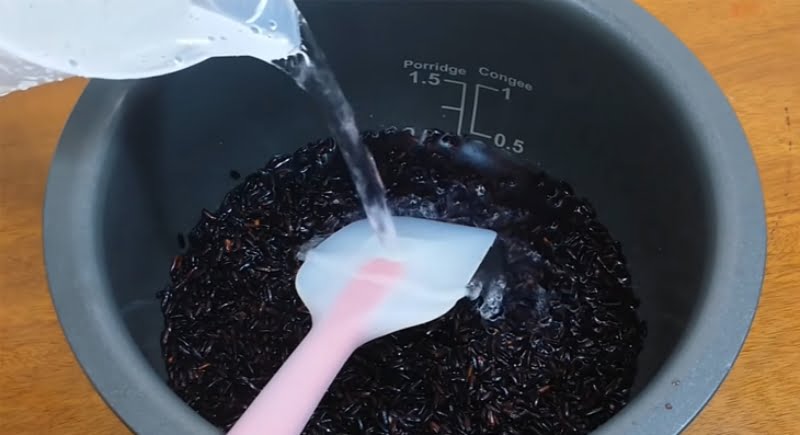 - Cho gạo vào nồi cơm điện, cho nước lấp sấp mặt gạo. Bắt đầu nấu gạo nếp cẩm như nấu cơm hằng ngày.